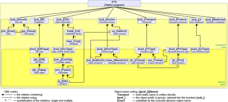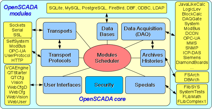 It can be seen from the diagram that OpenSCADA contains modular subsystems: "Archives-History", "Databases", "Transports", "Transport protocols", "User Interfaces", "Data Acquisition" and "Special", as well as subsystems: "Security" and "Module's management". The diagram shows the relationships between modular subsystems and modules of the corresponding types.