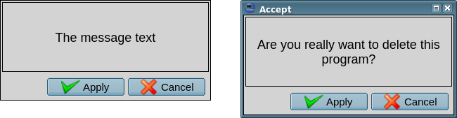 The element on Figure 4.7 implements a simple operations' acception dialog. The dialog contains a message with a question and two buttons "Apply" and "Cancel". The dialogue, for example, is used in the frame Users manager to accept the deleting operation.