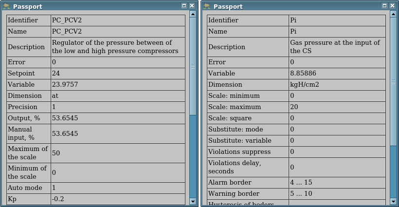 For any displayed or controlled parameter the passport can be obtained by clicking the right mouse button on the contour field. The passport will present all the properties of the parameter.