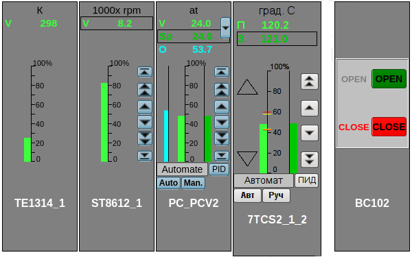 In the runtime mode, in the main field of the element, there are displayed the parameter name, the regulator mode (only for the regulators) and the current value-variable of this parameter; which, depending on the presence of a violation, are displayed in the color style: labColorGood, labColorWarning, labColorAlarm; and in which value the image of the inquieted parameter may blink. At the hardware errors and non validity the data, the last value is grayed out and crossed out. In the tooltip the user may get the linked parameter description and its errors.