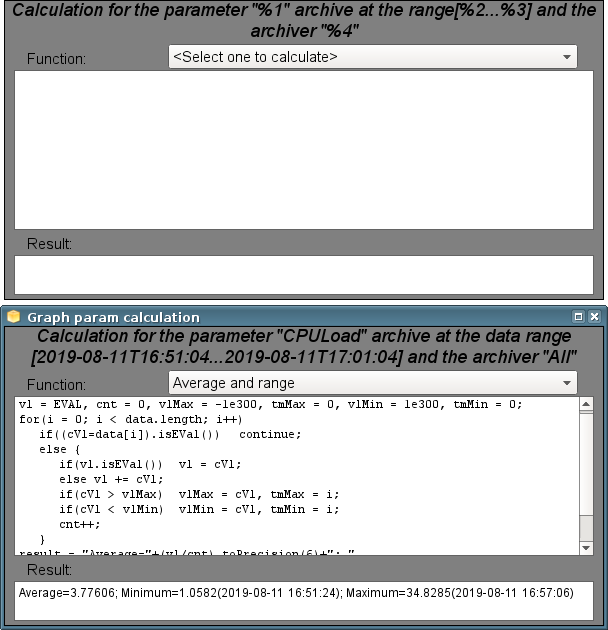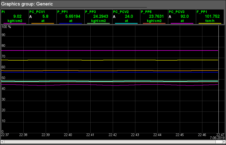In the trends of the analog parameters building the attributes are separately processed for alarm [aMin...aMax] and warning scales [wMin...wMax], which are also displayed in the graph.