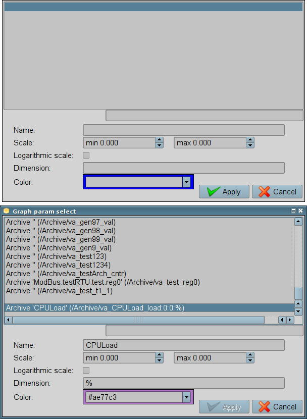 The history is provided in the following two tabs "Trends" and "Data", which may not be available in the absence of the history-archives at standard attributes. The "Trends" tab contains a graphics area, of the primitive "Diagram", on most of the window, and a table at the bottom with the names, colours, and graph scales. The graphs are updated periodically and built with a period of 1 second and a fixed depth of 1 hour. The "Data" tab contains only the "Document" primitive field with a table with attribute values in columns that is updated with a period of 1 second for the history data period and to a depth of 100 records. The following items of the representative parameter structures are considered standard attributes with history: