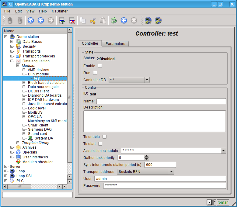 To add a data source, in OpenSCADA creates and configures the controller object. An example of the configuration tab of a controller object of this type is shown in Figure 2.