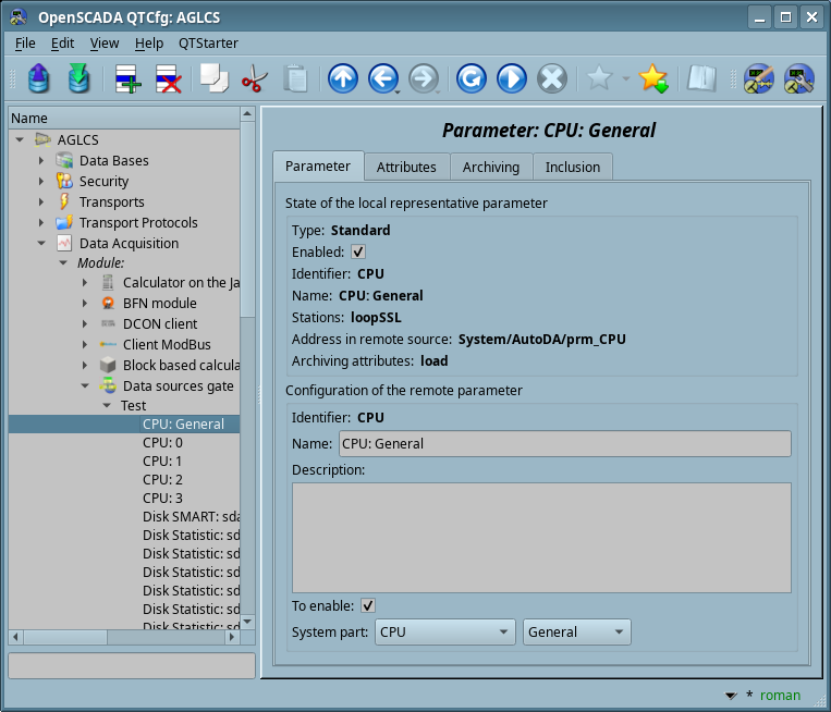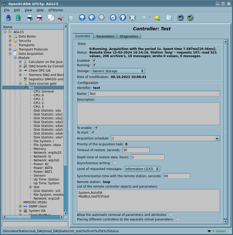To add a data source a controller object of OpenSCADA is created and configured. An example of the configuration tab for a controller object of this type is shown in Figure 2.
