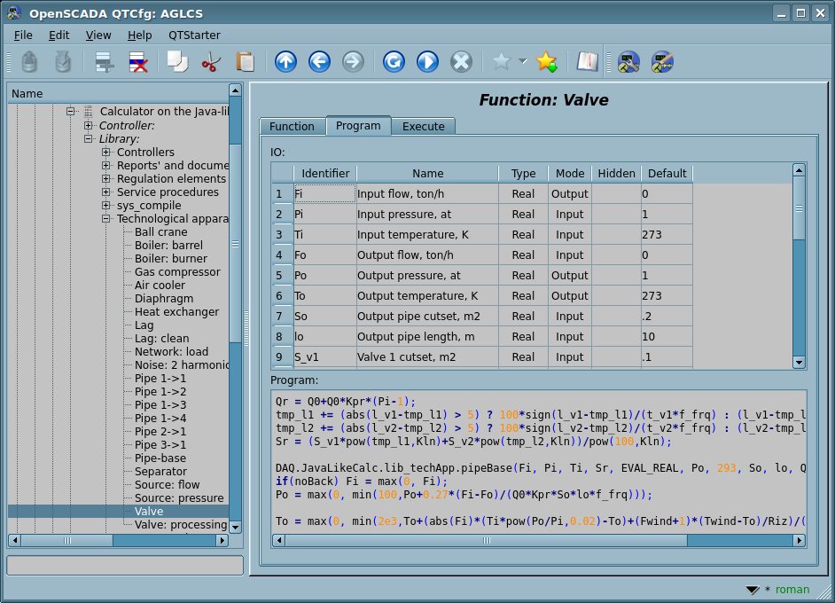 Parameters of functions can be freely created, deleted or modified. The current version of the module supports up to 65535 parameters of the function, in the sum with the internal variables. The view of editing functions in the OpenSCADA configurator is shown in Figure 1. The parameter name's rows after the first one treat as help.