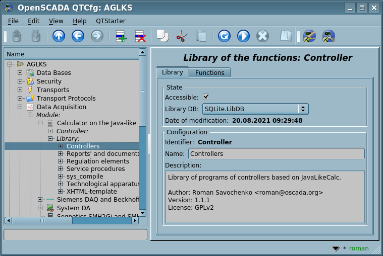 The controller object of the module, to provide immediate calculations, connects with the functions of libraries, built with his help, or with the data acquisition template. In the case of a data acquisition template, the possibility of external linking with other parameters and attributes of the subsystem "Data Collection" is added. In order to provide calculated data in OpenSCADA, parameters can be created in the controller object. Example of the configuration tab of the controller object of the given type shown in Figure 2.