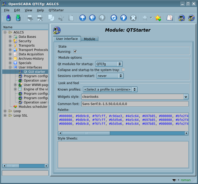In general, the module now controls overall: Qt widget style, common font, interface palette, and cascading style sheets. This control is performed through the parameters of the configuration file "Style", "Font", "Palette", "StyleSheets" and module configuration (Fig.4).