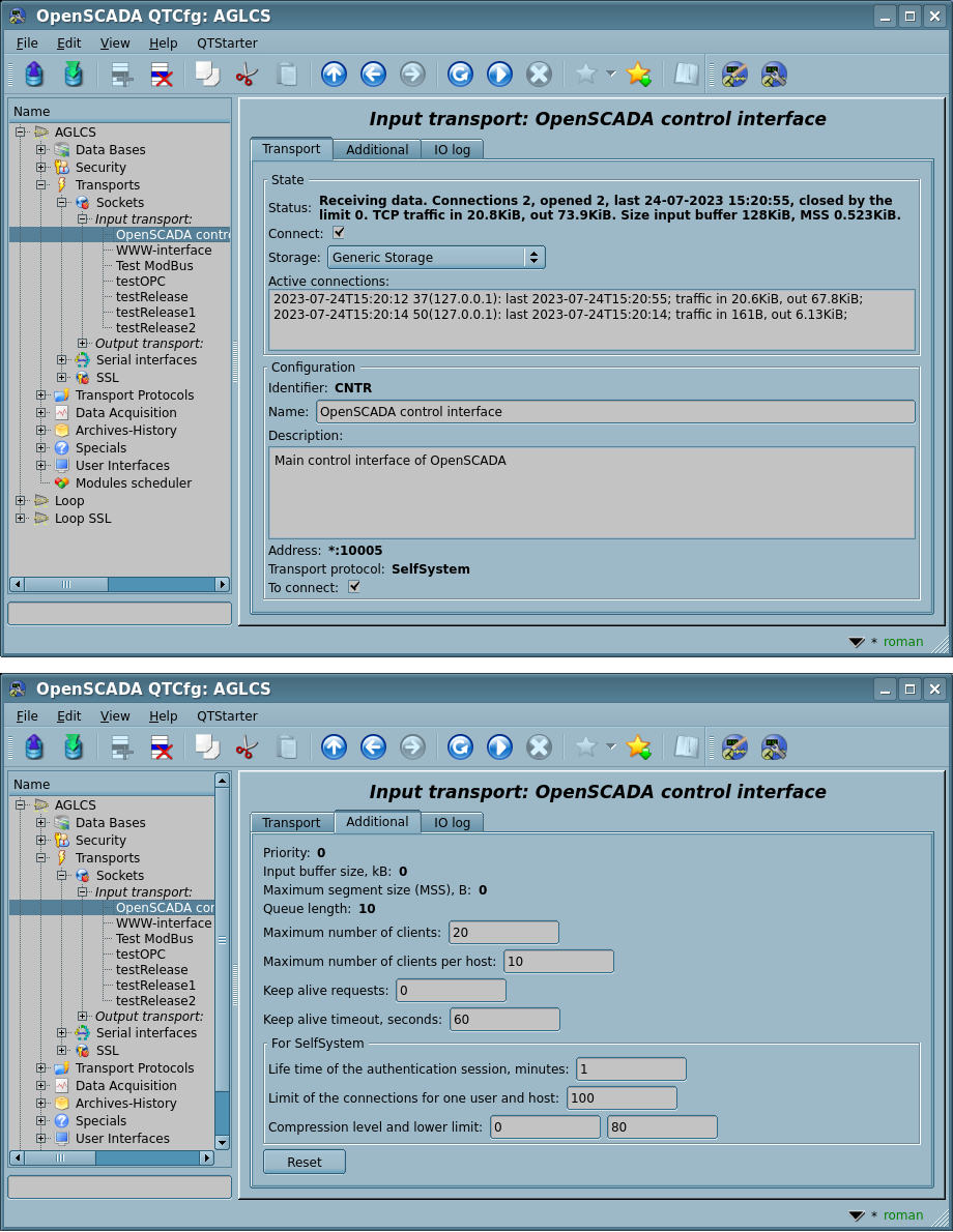 - State of the transport, that is: status, "Connect", name of the storage (containing the configuration) and information about the active connections.