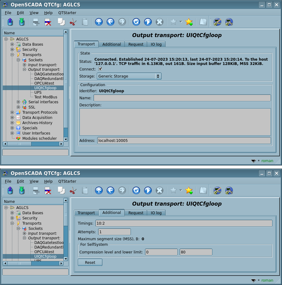 Configured and running output transport opens a connection to the specified server. In the case of destroying the connection, output transport is stopped. In order to resume the connection transport must be re-run, that all protocols do automatically.