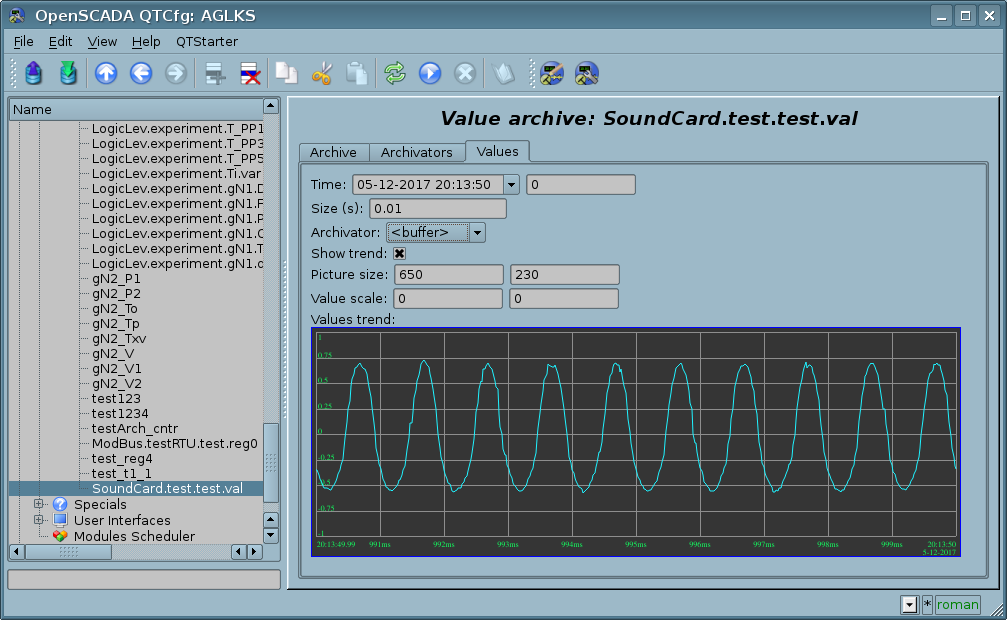 Structure of the module reflections of the object "Controller" of the subsystem "Data acquisition" on a separate audio input device available in the system. The object "Parameter" of the subsystem "Data acquisition" reflects a separate channel available from the sound input device to the attribute "val". The most functional is to use the attribute "val" in conjunction with the archive, or at least with its buffer. In the case of the archiving enabling the data of the channel of audio input are placed in the buffer of the archive by the packages with the frequency of the data acquisition of the input device that allows you to perform further operations on that data. In addition, the last package value is installed as the current value of the attribute. In the case of archive absence operation of the last package value placing as the current value of the attribute is performed only.