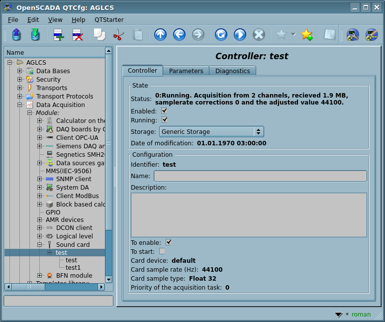 To add an audio input device a controller object is created and configured in OpenSCADA. Example of the configuration tab of the controller object is shown in Figure 1.