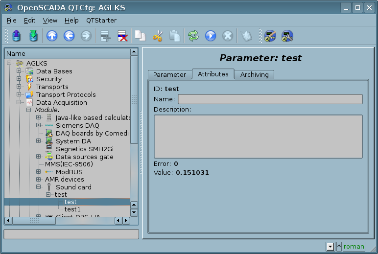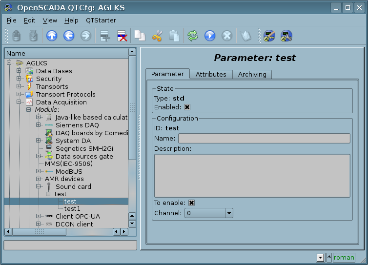 To add a channel of input sound device a parameter of the controller object is created and configured in OpenSCADA. Example of the configuration tab of the parameter is shown in Figure 2.
