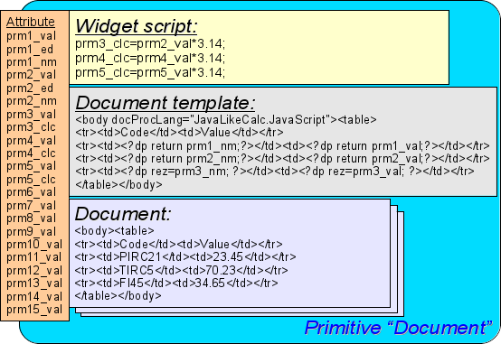 At the session level widget contains a object of values of calculation procedure. This object is initiated and used in the case of presence of the calculation procedure itself. At the time of the initialization, the list of parameters of the procedure is created and a compilation of the procedure is performed with these parameters, in the module that implements the selected programming language and with the name of the resulting procedure in the form of a coded full name of the widget. The compiled function is connected to the object of values of the calculation procedure, and further the calculation is performed with the session period.