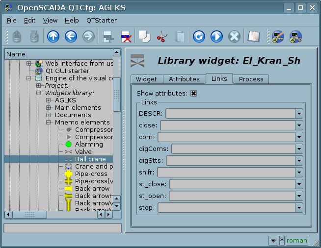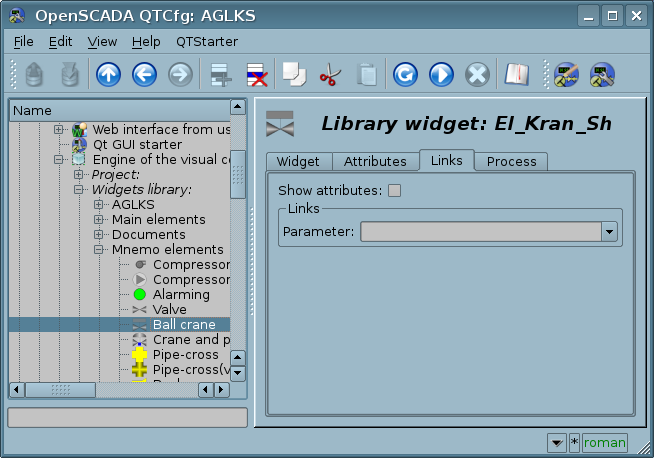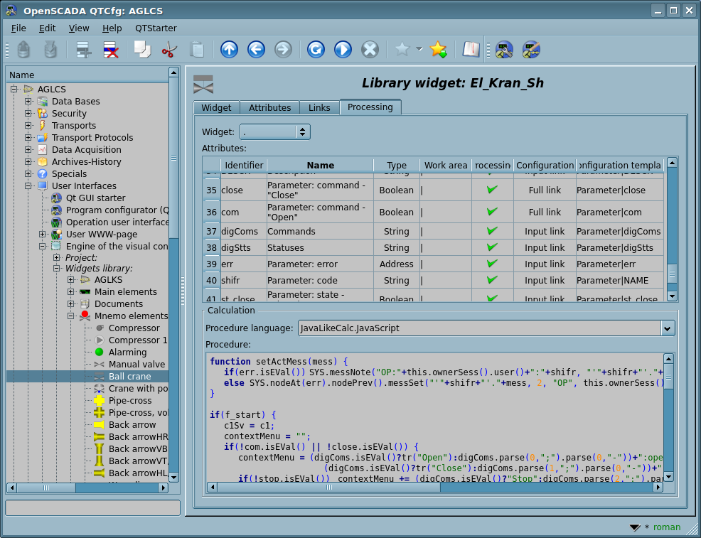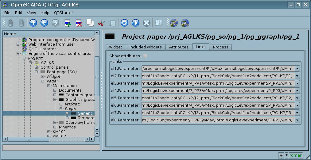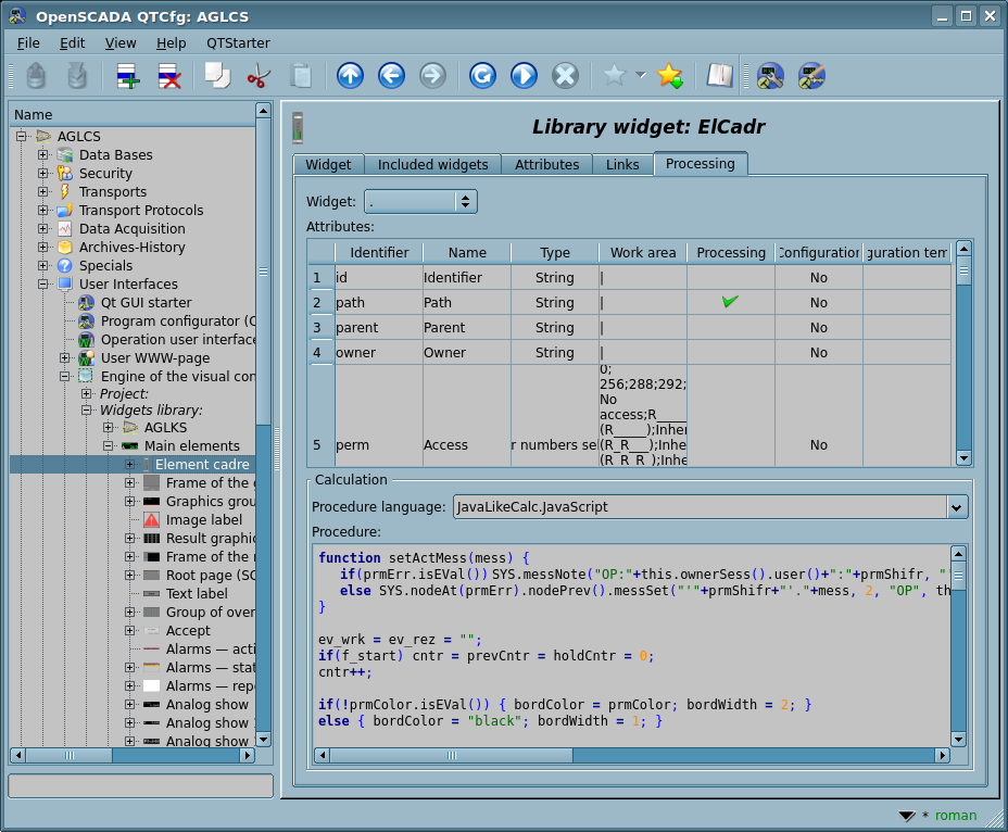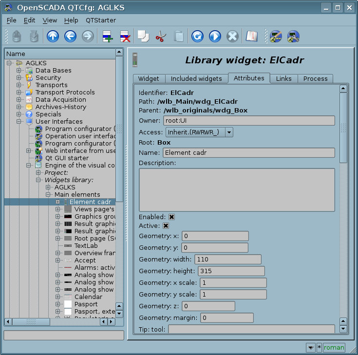 Setting and linkage of the widgets is done through their properties. Parent widget and the widgets it contains, can be complemented by user properties. Then, the user and static attributes, are associated with the properties of included widgets by internal logic. To show the dynamics (current and archived data), properties of the widgets are dynamized, that is linked with the attributes of the parameters of OpenSCADA or properties of other widgets. Using, for linking nested widgets by internal logic, the user programming language of OpenSCADA relieves the issue of implementing a complex visualization logic, thus providing high flexibility. Practically, you can create fully dynamized frames with complex interactions at the user level.
