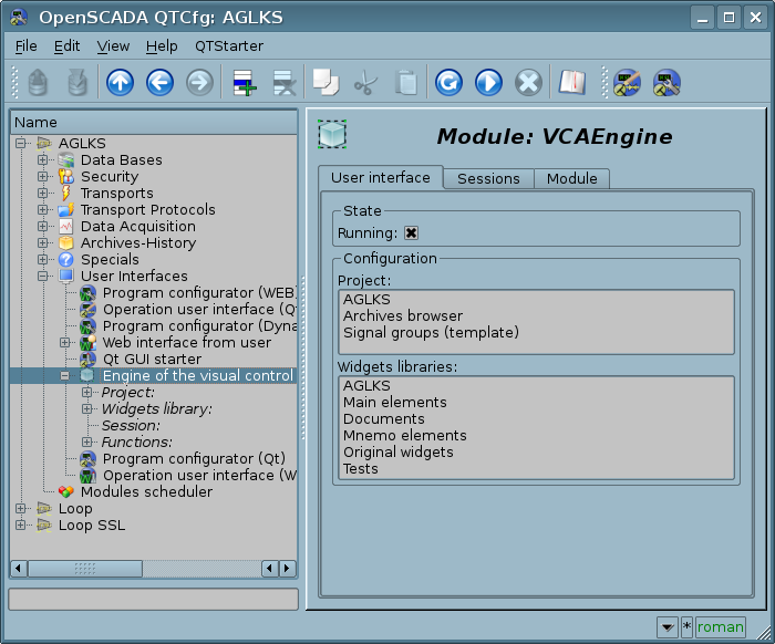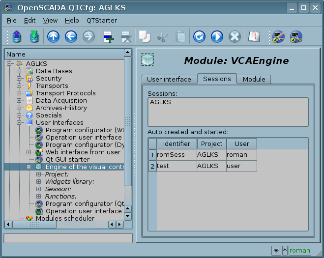 Through the control interface of OpenSCADA, components that use it, can be configured from any configurator OpenSCADA. This module provides an interface to access all the data object of the VCA. Main tab of the configuration page of the module provides access to widgets libraries and projects (Fig.4.1). The tab "Sessions" provides access to opened sessions of the projects (Fig.4.2).