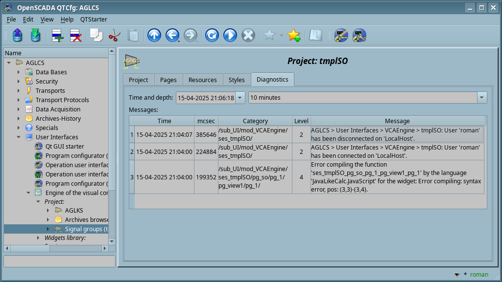 From this tab you can select time (or refresh to current) and depth to obtain the diagnostic messages of the sessions of running this project.