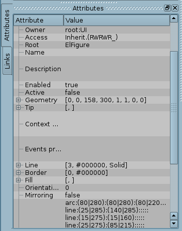 Using the "Line" field of the "Attributes" tab, lets define the width, color, line style of the figures, which we'll draw. With the "Border" field let's define the width and color of the border. The "Fill" field allows you to specify color, and image for the fills. "Elements list" contains a list of primitives used to create the graphical object. Elements of all fields of the "Attributes" tab can be dynamically changed in the user procedure.