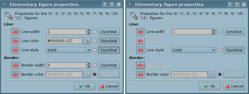 If the dialog is called for the group of selected figures (Fig.5.5.b), properties (attributes) listed in the dialog will be applied to all figures listed in the title of the dialog. When you call the dialog, in the fields of the properties will be shown the data of the figure from the group of selected ones, for which it was called the popup menu. There is the possibility to include/exclude certain properties of the dialog. For this the (