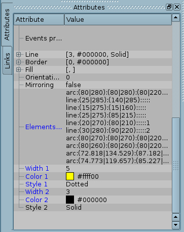Then, the "Attributes" tab will be appended by the fields: Point 1 (1), Point 2 (2), Width 1(w1), Width 2(w2), Color 1(c1), Color 2(c2), Style 1 (s1) (Fig. 5.3.b). Values of these fields can be changed in user's procedure, using the user programming language of OpenSCADA. Obviously, if desired, not all properties of the primitive can be declared dynamic, but one or more, in addition, one dynamic property can be used repeatedly.