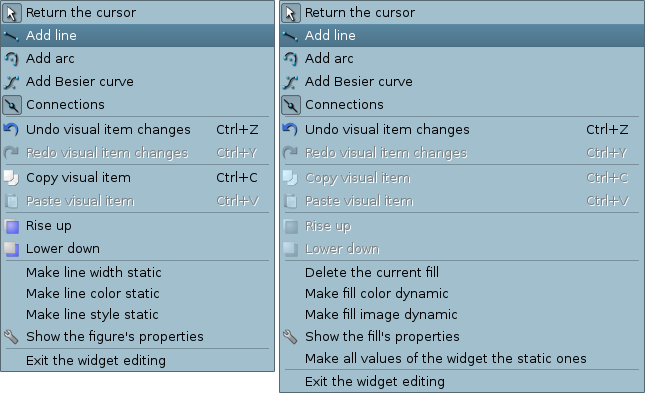 The popup menu by the right-clicking in the editable widget is provided. Depending on what an object is under the mouse, popup menu can take several different forms. Below, in Figure 5.4, there are examples of the popup menu.