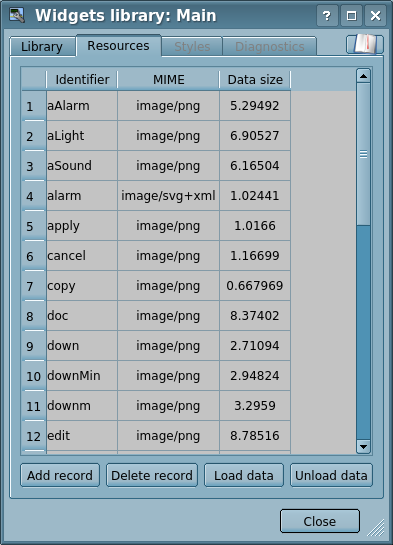 - Tree of the widgets libraries. Using the navigator you can quickly find the needed widget or library and to do with them necessary operations. The following operations are implemented: add, delete, copy, call for settings of the widgets and libraries, cleaning and call for visual editing of the widget. For flexible control, the context menu is supported with the following items: