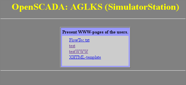 Addressing of the pages begins with the second element of the URI. It is connected with the fact that the first element of the URI is used to identify the user WWW-interface module. For example, URL http://localhost.localdomain:10002/WebUser/UserPage can be deciphered as a call of the user page "UserPage" of this module on the host "localhost.localdomain" on port 10002. In the case of absence of the second element of URI and instruction to display an index of the user pages in the configuration, the index of the pages is generated (Fig.1).