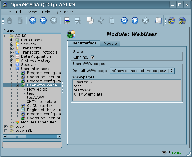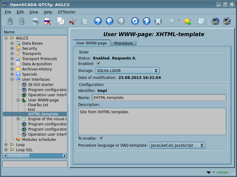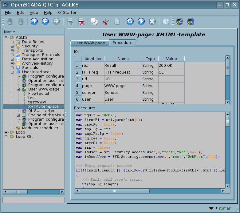 The module provides the user with a mechanism to create WWW-pages, and can process other WWW-requests in internal OpenSCADA language, usually JavaLikeCalc, without involving low level programming. As a page processor, the module allows you to use standard DAQ-Templates. Using DAQ-Templates allows you to create WWW-page libraries and call them in this module multiple times as their implementations, as well as provide the data context of the template with their connection to the data of the subsystem "Data Acquisition".