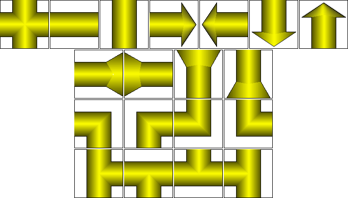 Элементы на рисунке 1.1 служат для построения трубопроводов любой сложности, необходимой ширины и окраса. По умолчанию они заполнены желтым цветом, угол поворота составляет 0° и отключено отражение.