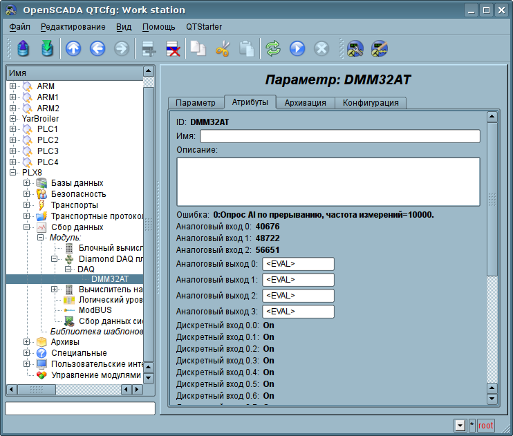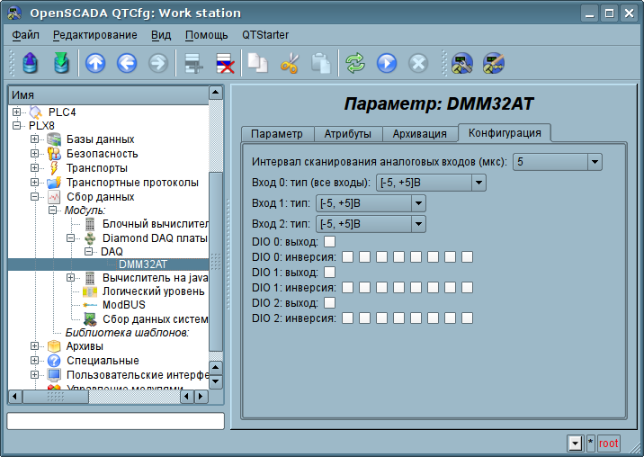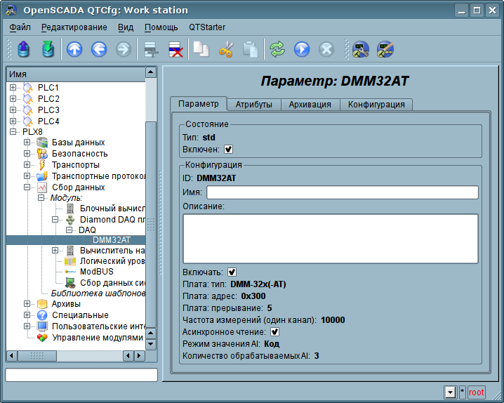 Объект параметра-платы непосредственно содержит конфигурацию отдельно взятой платы и предоставляет все доступные на плате данные в виде атрибутов. Пример вкладки "Параметр", конфигурации параметра-платы в целом, представлена на рис.2, а вкладка "Конфигурация", свойств сигналов, представлена на рис.3.