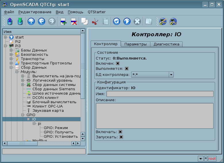 GPIO в OpenSCADA конфигурируется путём создания нового объекта контролера (Рис.1) и параметра контролера — один параметр GPIO для одной платы.