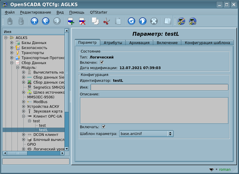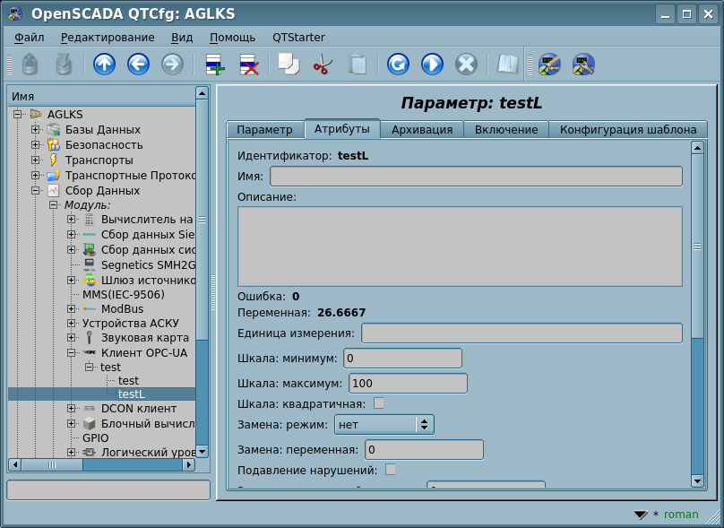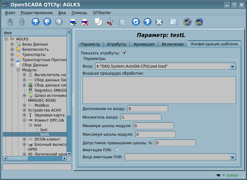 Для добавления источника данных OPC-UA создаётся и конфигурируется объект контроллера в OpenSCADA. Пример вкладки конфигурации объекта контроллера данного типа изображен на рисунке 4.