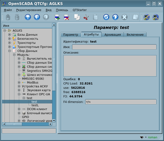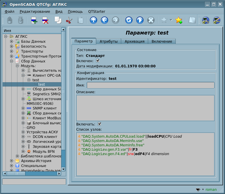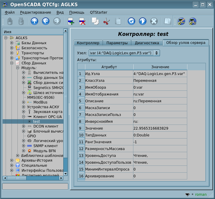 Модуль сбора данных предоставляет возможность опроса и записи атрибутов значения(13) узлов типа "Переменная" в режиме прямого опроса запросом "Read" и асинхронным сервисом запроса "Publish".