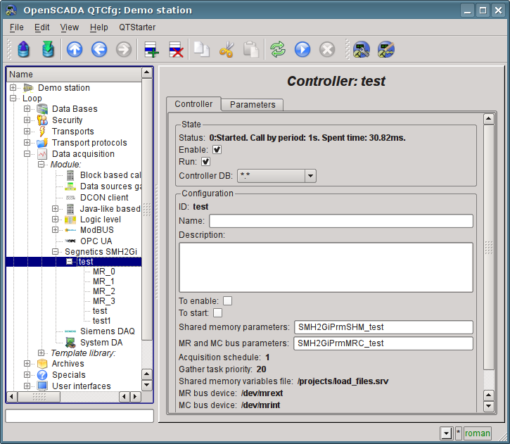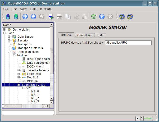 Для работы модулей MC и MR необходима предварительная процедура инициализации, которая заключается в отправке tune-запроса, специфичного для отдельно взятой модели модуля. Далее, для запроса/отправки данных, необходима информация о структуре модуля. Такого рода информация содержится в INI-файлах, по файлу на устройство. Директория с INI-файлами указывается во вкладке "SMH2Gi" страницы модуля (рис.1), а архив типовых *.INI файлов, адаптированный под нужды OpenSCADA, доступен здесь.