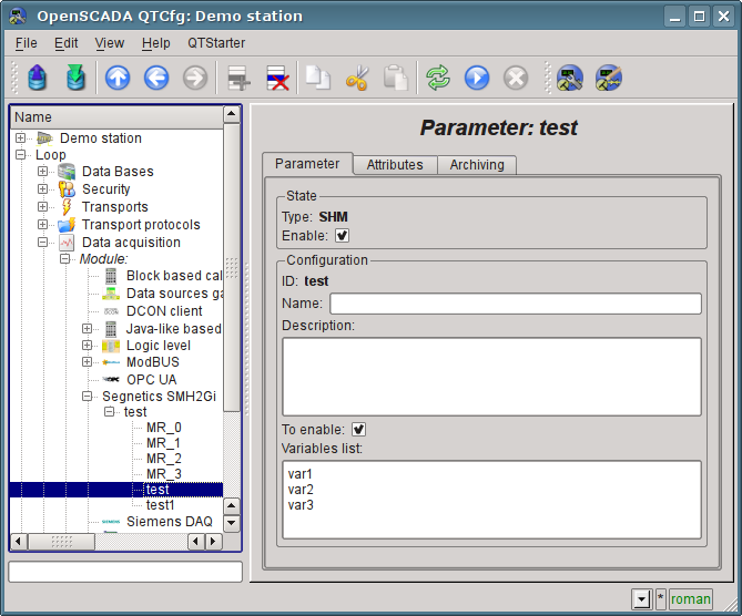 Тип параметра "Разделяемая память (SHM)" используется для взаимодействия с процессом "logix" через обмен переменными. Вкладка конфигурации объекта параметра этого типа представлена на рисунке 3. Процесс "logix" предусматривает четыре типа переменных, которые отражаются на атрибуты источников данных OpenSCADA следующим образом: