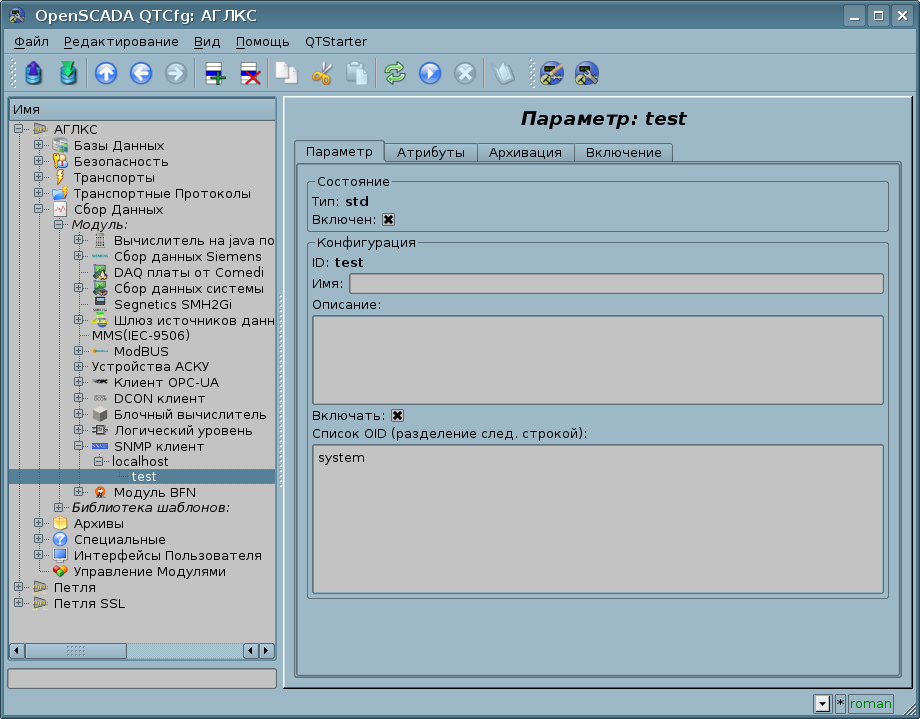 Для добавления источников данных SNMP в OpenSCADA создаются и конфигурируются объекты контроллера. Пример вкладки конфигурации объекта контроллера данного типа изображен на рисунке 1.