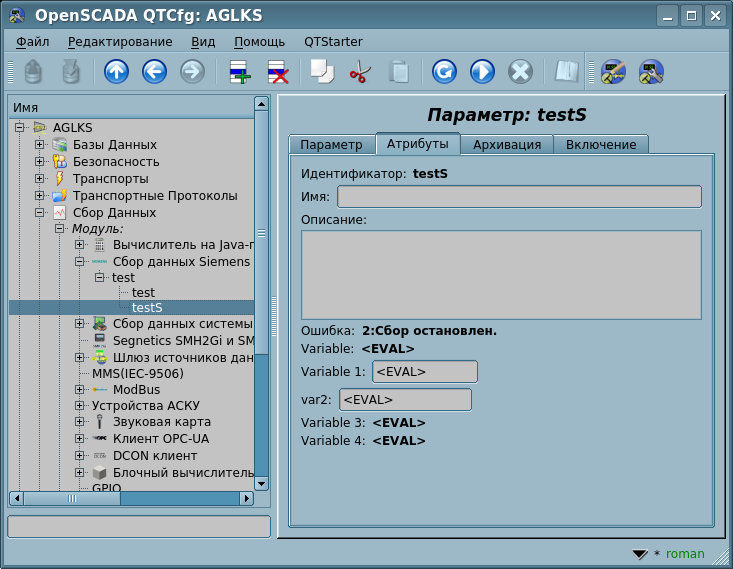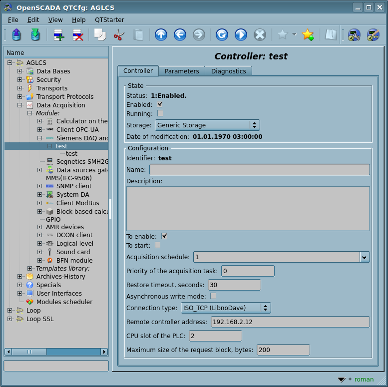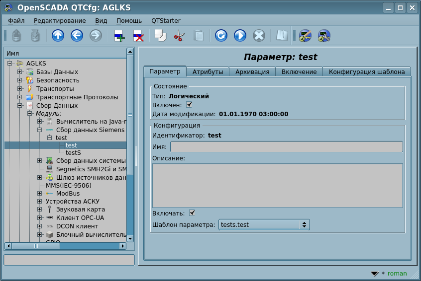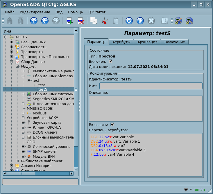 Для добавления источника данных создаётся и конфигурируется объект контроллера OpenSCADA. Пример вкладки конфигурации объекта контроллера данного типа изображен на рисунке 3.
