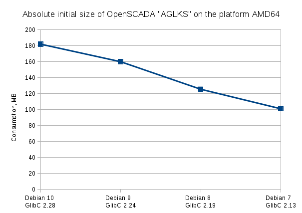 Debian 10 amd64, GLibC 2.28, GCC 8.3.0 + MALLOC_ARENA_MAX=2 | 181 | 189 | 190 | 195 | 195 | 194 | Satiated on the iteration 3, base consumption 8 MB, extra consumption 5 MB (62.5 %), liboscada.so 3.5 MB, ui_WebVision.so 0.75 MB | |