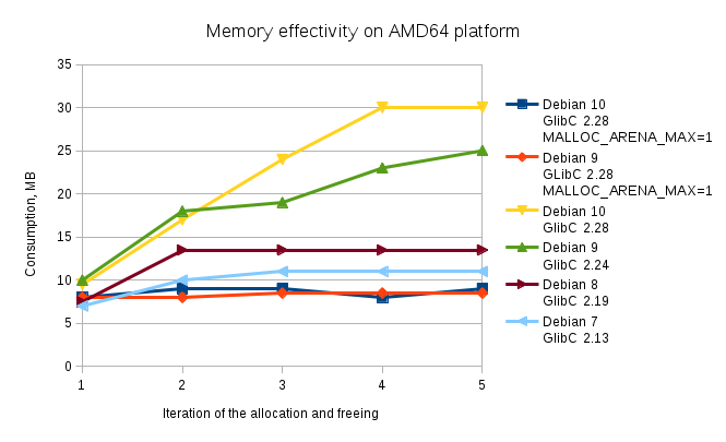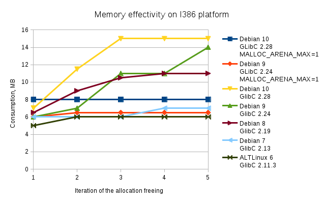 CONCLUSION: We see obvious degradation in the memory effectivity on the last Debian releases starting at Debian 8 (GLibC 2.19) on I386 and Debian 9 (GLibC 2.24) on AMD64, when the memory consumption increased up to 200% after 3,4 free-allocate iterations of the same data. To more presenting of the problem there have built follow images on the data basis:
