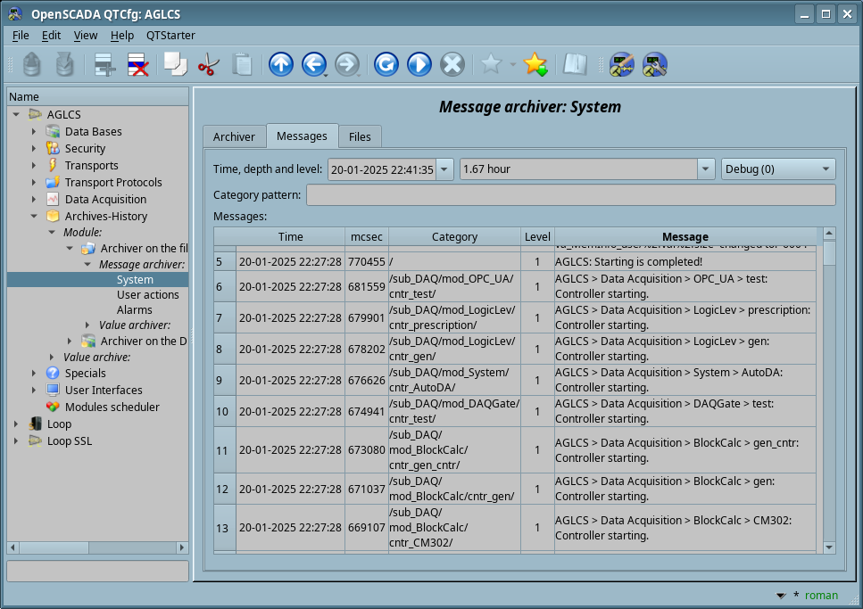 Сообщения в OpenSCADA характеризуются датой, уровнем важности, категорией и непосредственно текстом сообщения. Дата сообщения соответственно указывает на дату и время его создания. Уровень важности указывает на степень важности сообщения. Категория определяет адрес или условный идентификатор-ключ источника сообщения. Часто категория содержит полный путь к источнику сообщения в программе. Текст сообщения соответственно и несет главную смысловую нагрузку сообщения.