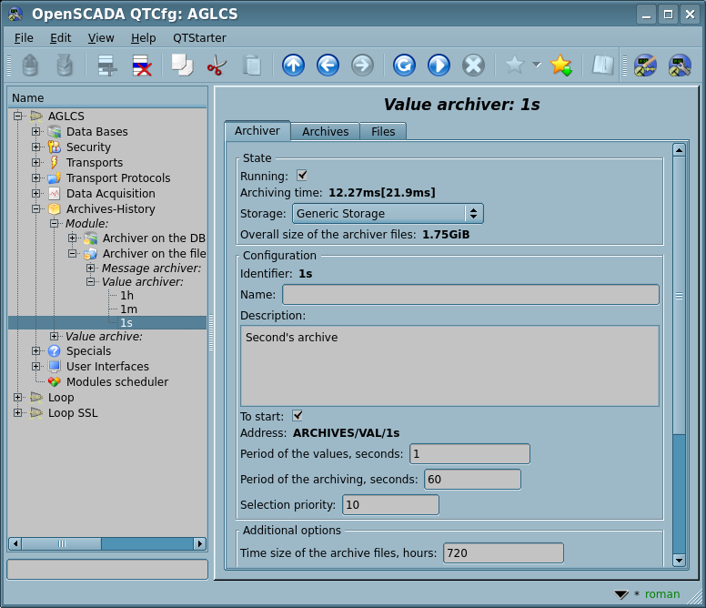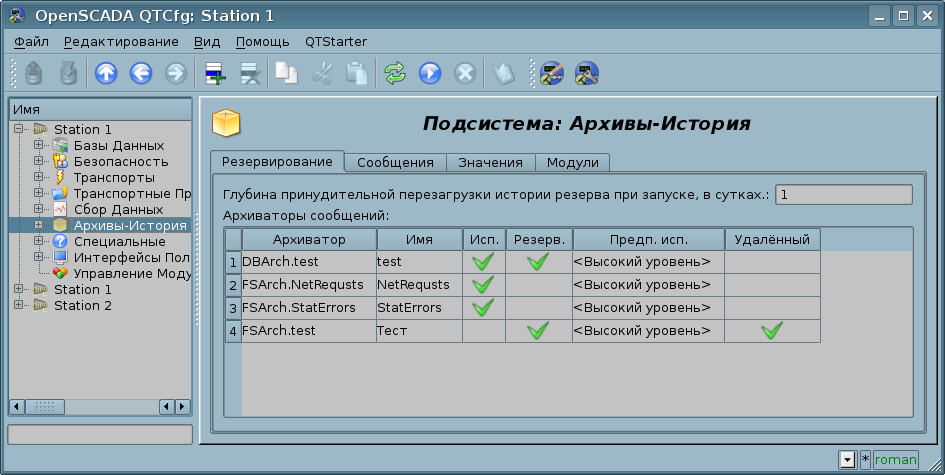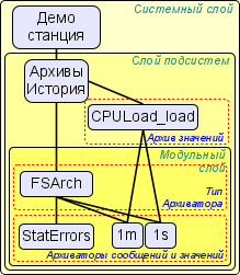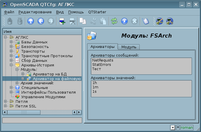 Для решения задач архивирования потоков данных в OpenSCADA предусмотрена подсистема "Архивы-История" (Рис.1.5), которая является модульной и позволяет вести архивы сообщений и значений. Модульным объектом, который содержится в подсистеме "Архивы-История", выступает тип архиватора. Тип архиватора определяет способ хранения данных т.е. хранилище — файловая система, СУБД. Каждый модуль подсистемы "Архивы-История" соответственно может реализовывать архивирование сообщений и значений, а сама подсистема может содержать множество архивов, которые обслуживаются различными модулями.