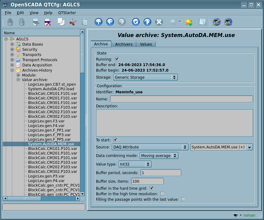 Ключевым компонентом архивирования значений непрерывных процессов является буфер значений, который предназначен для промежуточного хранения массива значений, полученного с указанной периодичностью (квантом времени). Буфер значений используется для непосредственного хранения больших массивов значений в архивах значений как перед непосредственным "сбросом" на физический носитель, так и для манипуляций с кадрами значений, т.е. в функциях покадрового запроса значений и их помещения в буфере архивов.