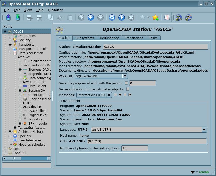 Детально рассмотрим структуру конфигурационного файла. Один конфигурационный файл может содержать конфигурацию нескольких станций в секциях <station id="SimulatorStation"/>. Атрибутом "id" указывается идентификатор станции — класс станции. Использование той или иной секции станции указывается параметром командной строки --station=SimulatorStation, при вызове. Секция станции непосредственно содержит параметры станции и секции подсистем. Параметры конфигурации секции записываются в виде <prm id="StName">AGLKS</prm>, где атрибутом "id" указывается идентификатор параметра, а в теле тега "prm" указывается значение параметра "AGLKS". Перечень доступных параметров и их описание для станции и всех остальных секций можно получить в консоли, посредством вызова OpenSCADA с параметром --help.