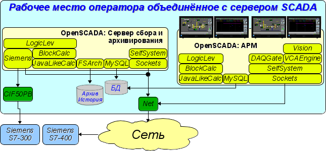 Смешанное подключение совмещает функции сервера и клиента (Рис.3.7). Может использоваться для тестовых, демонстрационных функций, а также для предоставления моделей и тренажёров технологических процессов как единое целое. В этом режиме могут выполняться следующие функции: