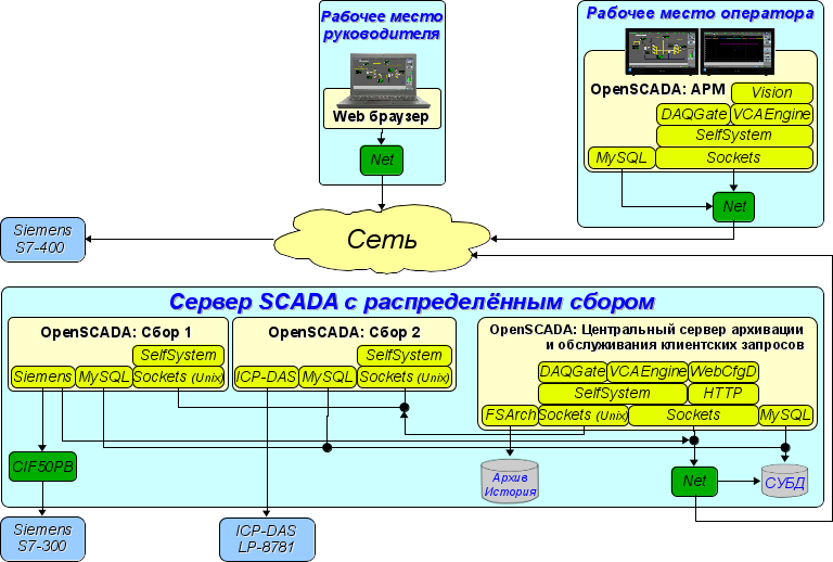 Для доступа клиентов к серверу используются доступные у OpenSCADA сетевые транспорты, на примере — Sockets; и транспортные протоколы, на примере — протокол OpenSCADA "SelfSystem".