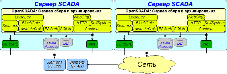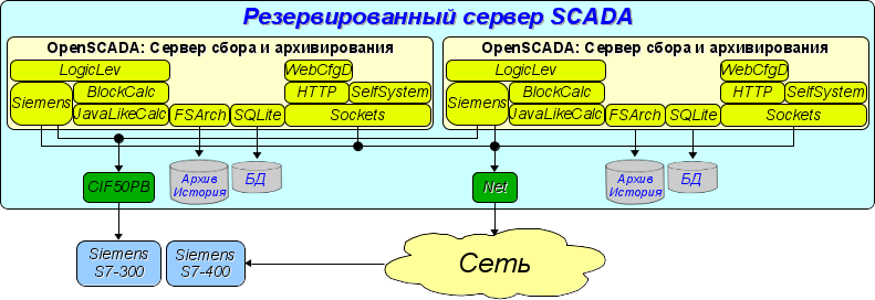 Для повышения надёжности и производительности OpenSСADA допускает множественное резервирование (Рис.3.2), при котором источники данных (контроллеры) и архивы-история одного экземпляра отражаются в другом. При использовании подобной конфигурации возможно распределение нагрузки опроса/вычисления по различным станциям. Данная конфигурация позволяет выполнять функции: