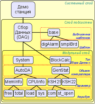 Отдельно взятый объект контроллера может содержать параметры определённых модулем типов. Например, параметры аналогового типа, основной информацией которых являются значения целого или реального типа. Структурно параметр представляет собой перечень атрибутов, которые и содержат данные. Атрибуты могут быть пяти базовых типов: логический, целый, реальный, символьная строка(текст) и объект. Структуры объектов контроллеров, параметров и их типов содержатся в подсистеме "Сбор данных", а объекты модулей осуществляют их наполнение согласно собственной специфики.