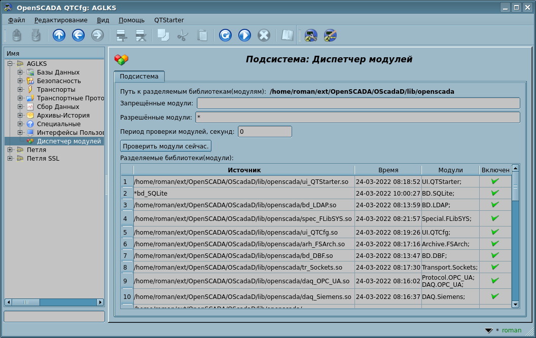 Управление модулями осуществляется подсистемой "Диспетчер модулей". Функциями подсистемы является: подключение, отключение, обновление и другие операции, связанные с модулями и библиотеками модулей.