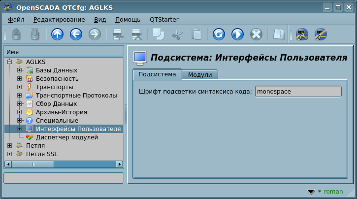 Подсистема "Пользовательские интерфейсы" является модульной и её модульным объектом выступает собственно конкретный интерфейс пользователя. Модульность подсистемы позволяет создавать различные интерфейсы пользователя на разных GUI/TUI библиотеках и использовать наиболее оптимальное решения в конкретно взятом случае, например, для среды исполнения программируемых логических контроллеров можно использовать конфигураторы и визуализаторы на основе Web-технологий (WebCfg, WebCfgD, WebVision, WebUser), а в случае стационарных рабочих станций использовать те-же конфигураторы и визуализаторы, но на основе библиотек вроде Qt (QTCfg, Vision).