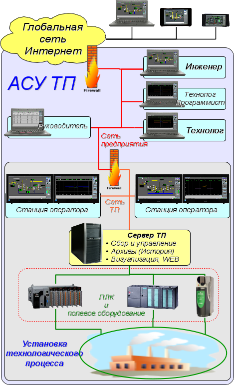 SCADA (Supervisory Control And Data Acquisition) в общем виде имеют распределённую архитектуру вроде изображённой на рисунке 2. Элементы SCADA систем, в смысле программного обеспечения, выполняют следующие функции: