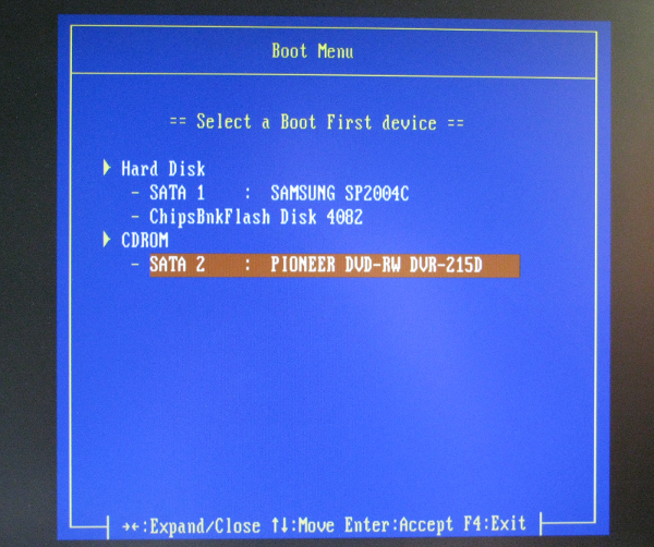 Для завантаження з отриманого "живого диску" треба перевантажити комп'ютер та на самому початку завантаження до стаціонарної ОС натиснути клавішу входу до меню завантаження BIOS та обрати там наш носій (рис.1). На різних комп'ютерах клавіша входу до меню завантаження може відрізнятися та бути однією з: "F8", "F9", "F10", "F11" або "F12". На деяких комп'ютерах змінити порядок завантаження можна тільки у самому BIOS.